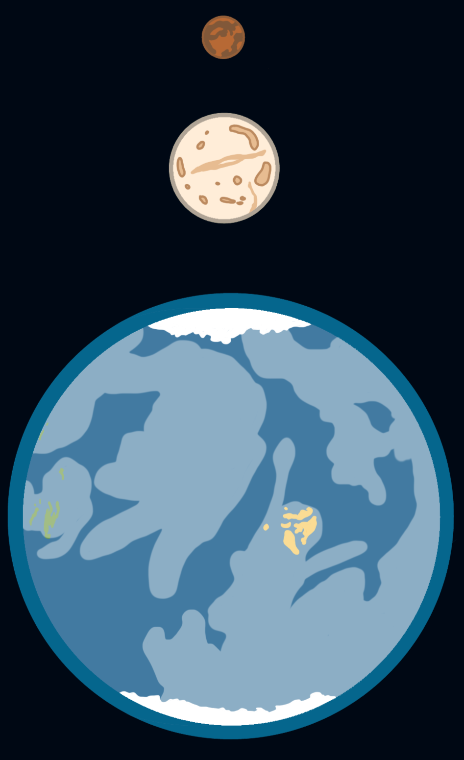 Omoa has two moons, Alek and Jao. While they are both smaller than our Earth moon, Alek is significantly larger between the two. The first moon of Omoa, Alek, has a sandy yellow color. It has several craters and a Mars-like crater. The second moon, Joa, is much smaller. The tholins give the moon a reddish-brownish color.